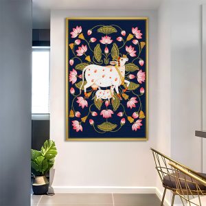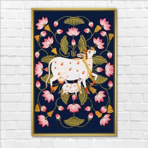 Kamadhenu Cow with Lotus Floral Motif Pichwai Painting